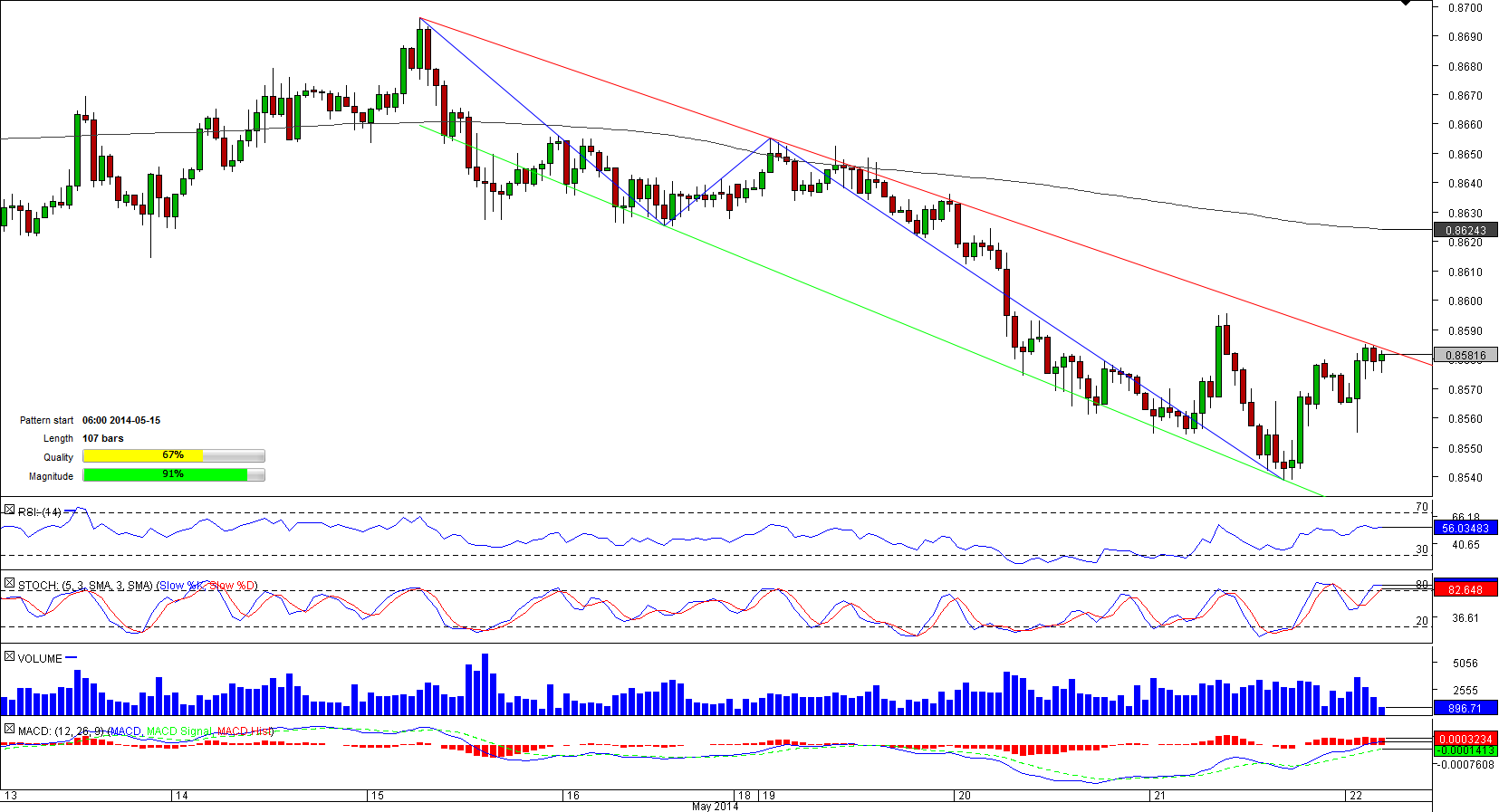 NZD/USD followed a lost-lasting bearish trend after it reached a three-year high of 0.8780 early May. The currency pair entered a downward sloping tunnel that took the instrument to a one-month low 0.8539 in the second part of May.