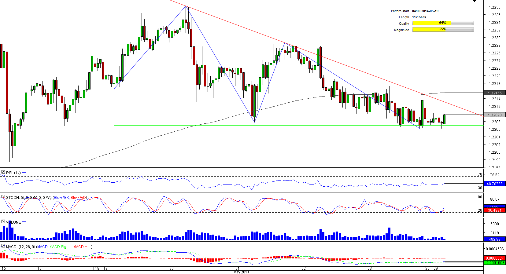 The pair has been rallying for the last two hours and if the trend persists, the pair may surpass the upper limit of the formation before long. SWFX traders also somehow share the view that the upcoming breakout may take place soon and is likely to be bullish- almost 57% of all orders are placed to buy the currency couple. However, to confirm this, EUR/CHF has to overcome a formidable resistance at 1.2212/3 represented by four-hour R2, daily R1; 50-hour SMA and the pattern's trend-line.