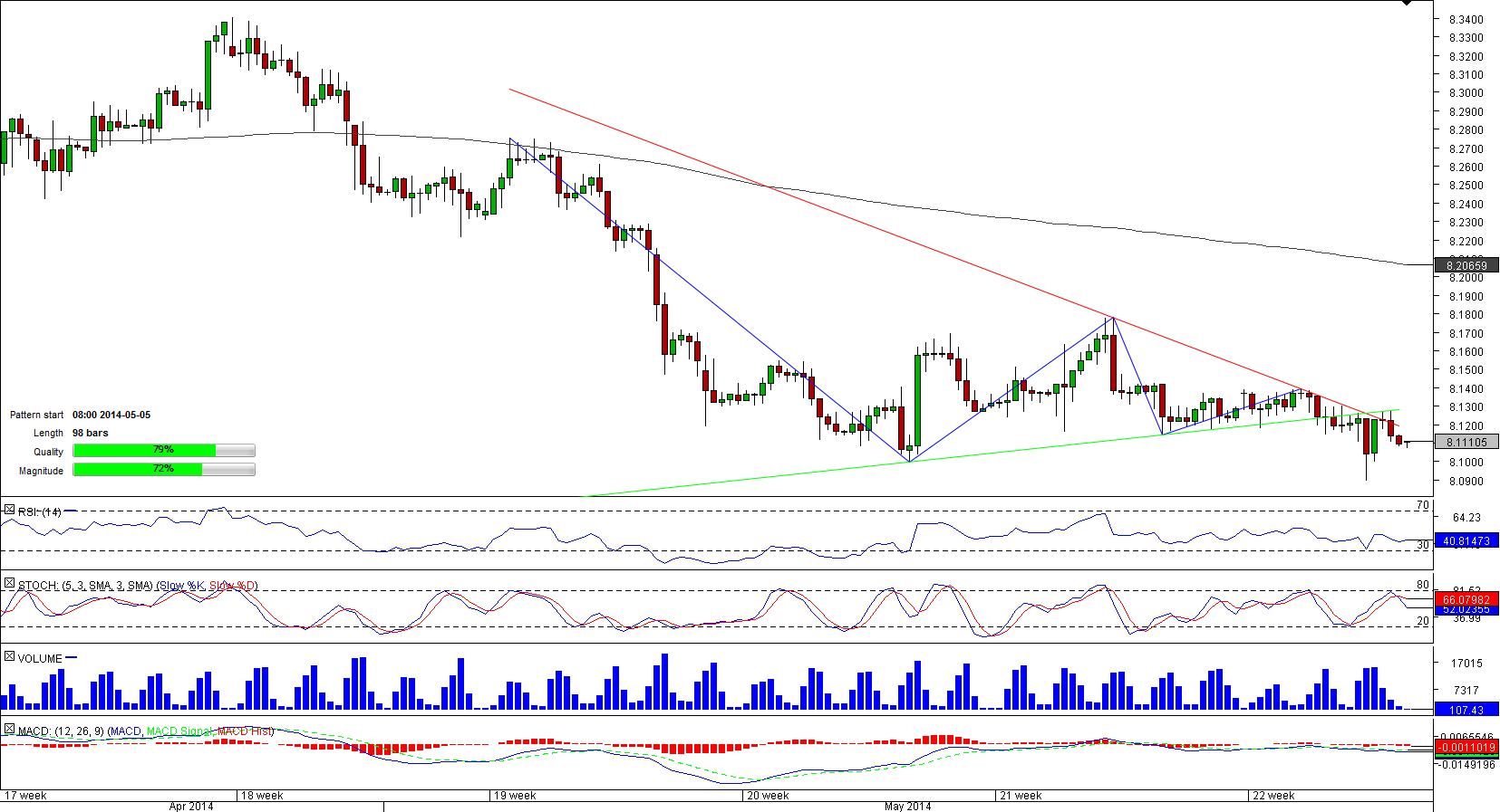EUR/NOK has been in the down-trend since early February when it re-approached a two-year high of 8.5492. One of the formations developed during this slide is a 98-bar long triangle pattern started in the beginning of May.