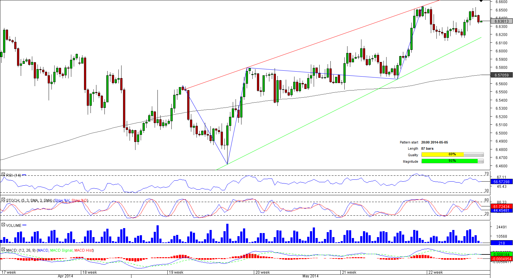 A sharp advance performed by USD/SEK took the pair to a six-month high of 6.6539 during three weeks started early May when the instrument embarked upon formation of the 87-bar long rising wedge pattern.