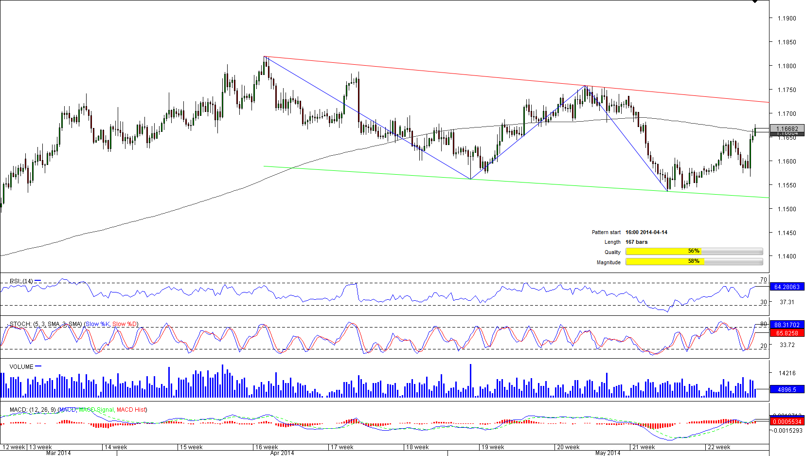 Since April 14 the AUD/SGD currency pair has been fluctuating between two parallel trend lines. After a recent re-test of the support line at 1.1531, it is now bull's turn to push the price towards the upper trend line. While short– and medium-term aggregate technical indicators are neutral, we still can expect a move higher, at least to the weekly R1 at 1.1690, as the price was already trading above the 200-period SMA. Furthermore, 72% of Dukascopy traders believe in bullish scenario and are opening long positions. While a move towards pattern's resistance will usually be interpreted as a ‘sell' signal, long-term bullish signal from technicals is pointing at the penetration.