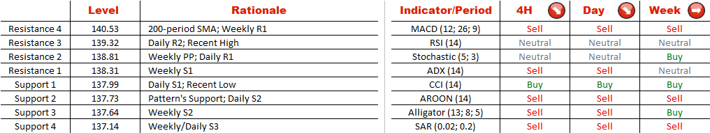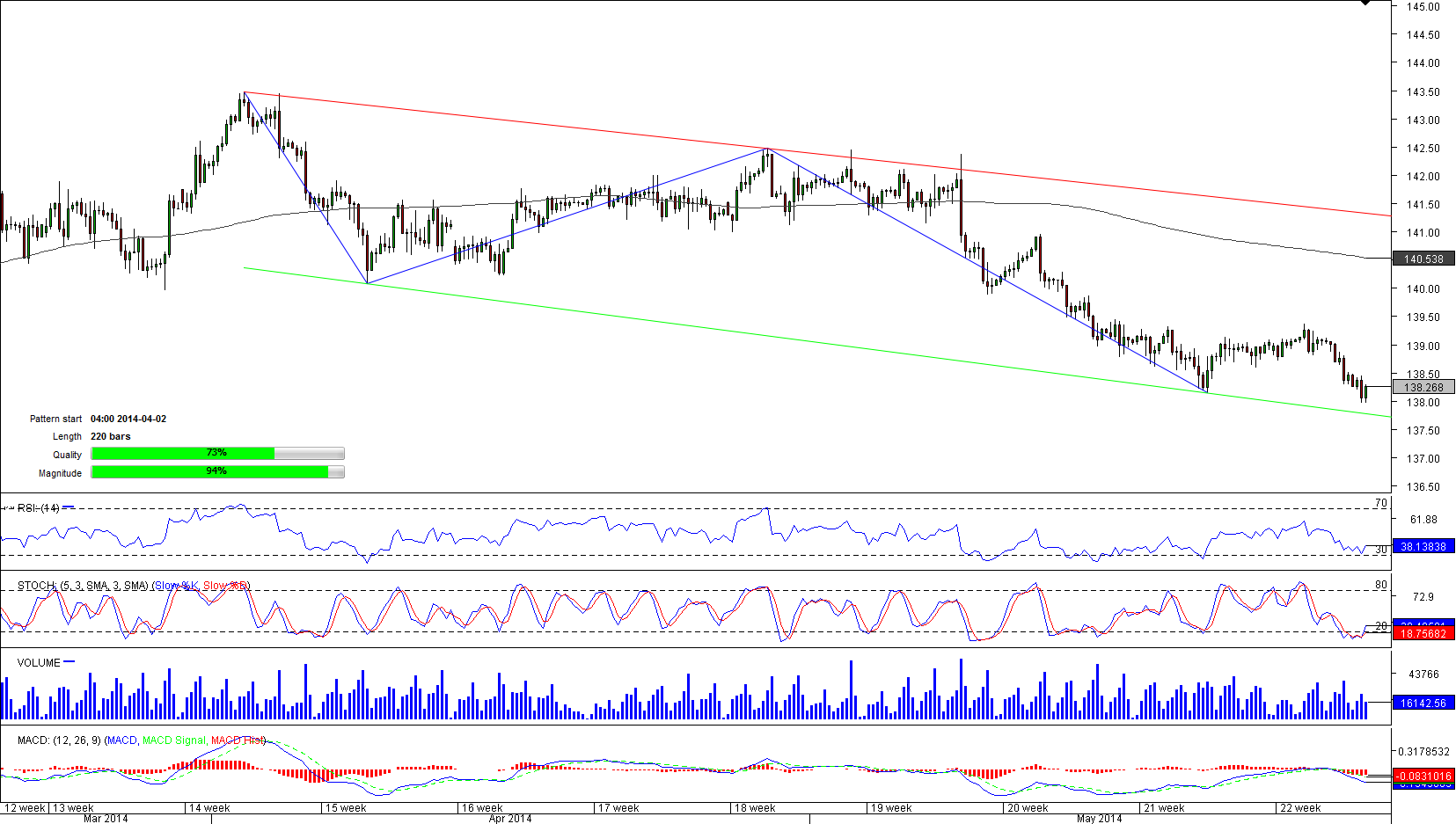 The GBP/JPY is struggling at the crucial level, represented by pattern's support. A move below 169.66 will mean a long period of depreciation, while in case of a pullback, the pair will continue fluctuating between two horizontal trade lines. Market sentiment is not clearly marked, while technicals are supporting the case for pair's depreciation. At the same time, statistically, a