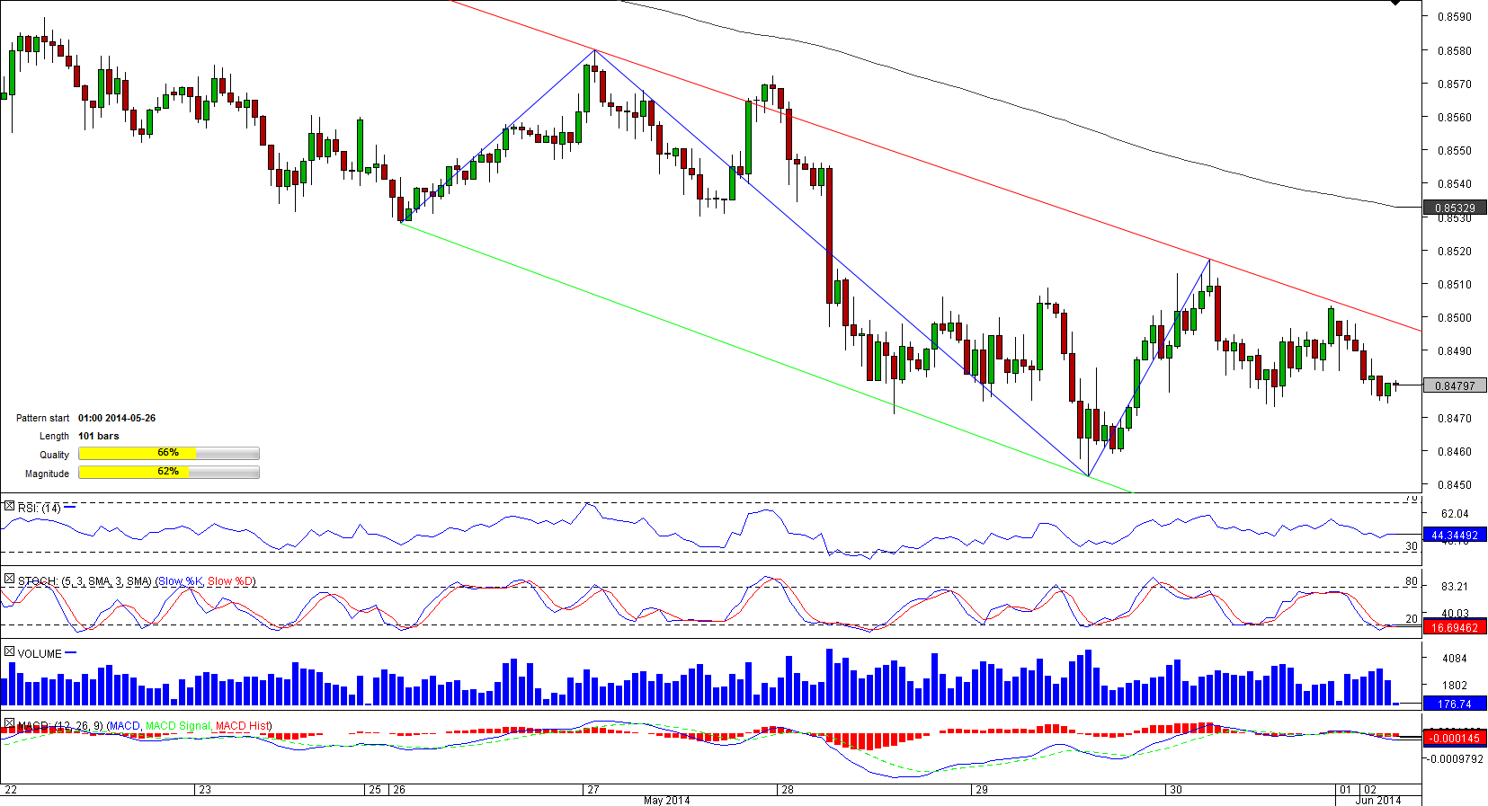 During more than two months started in mid-March, the Euro was depreciating against the British Pound; however, the currency pair managed to halt its slide by entering a bullish tunnel on May 22.