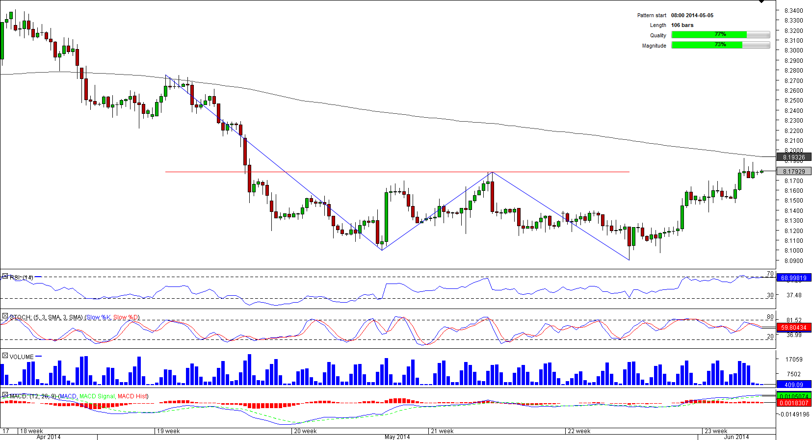 More than a one-month decline by EUR/NOK has become a part of the 106-bar long double bottom pattern. During the period of its weakness, the pair twice touched the mark of 8.0899, a six-month low. The second stab to this level provoked a jump that took EUR/NOK to the neck-line at 8.1781. For the last 20 hours, the pair has been struggling at this formidable resistance but up to now the breakout has not happened. Meanwhile, market sentiment is neutral, while technical data somehow confirms that the breakout is possible by sending a clear ‘buy' signal in the short-term.