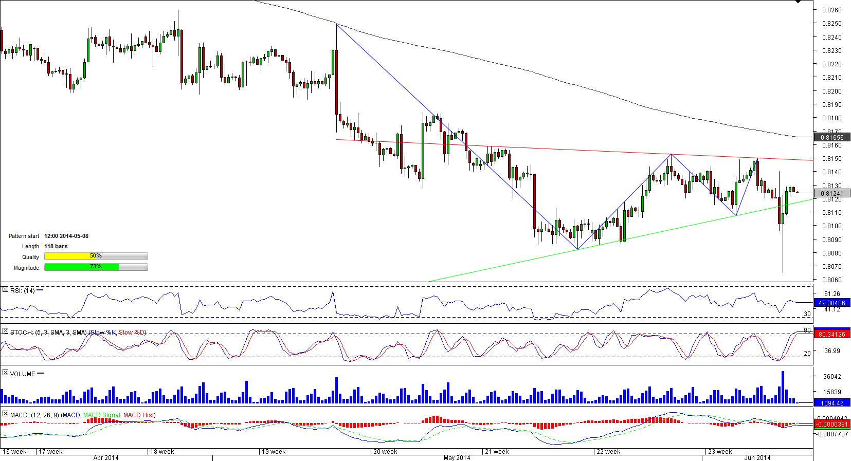 The single European currency has been losing value relative to the British Pound since mid-March; however, early May, the pair decelerated the pace of its decline and entered a 116-bar long triangle pattern.