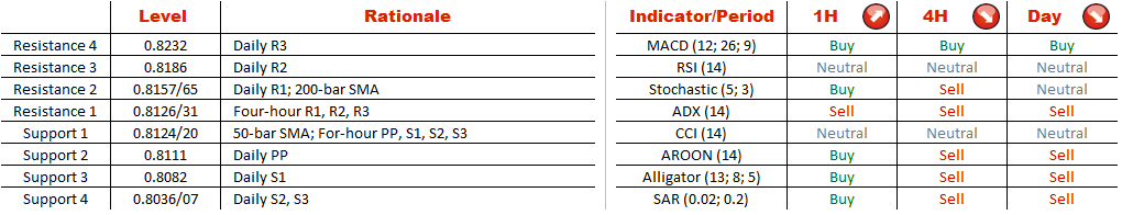 Several hours earlier, EUR/GBP suddenly plunged to a two-year low of 0.8064 but managed to recover all losses shortly after the dip and re-entered the pattern. Now the pair is likely to retreat from the current level near the 50-bar SMA at 0.8125 in the hours to come given the SWFX sentiment-almost two thirds of traders are bearish.