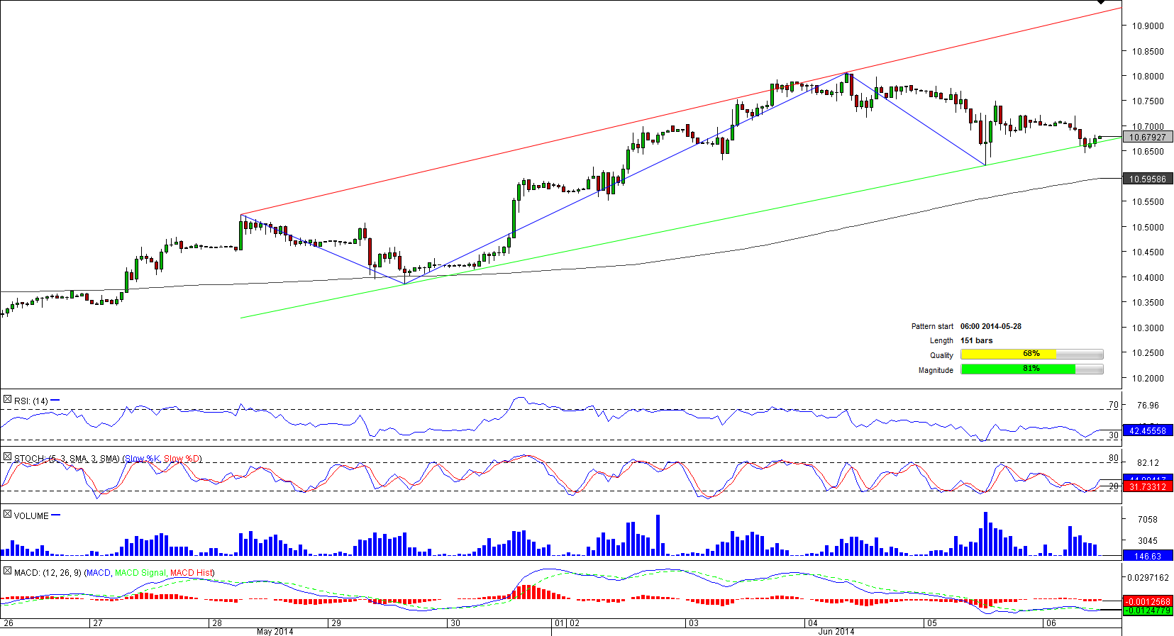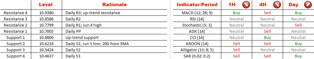 Following a massive February-April sell-off, USD/ZAR managed to bottom out at 10.2731 and change the direction of the market to a bullish one. As a result, the currency pair formed an upward-sloping channel. The pattern implies the U.S. Dollar will be underpinned by the lower trend-line while travelling towards the upper trend-line at 10.9380. However, USD/ZAR will have to breach a tough resistance represented by the daily R1 and Jun 4 high at 10.8043. On the other hand, if 10.66 does not initiate a rally, as suggested by the near-term indicators, the pair may find support at 10.6218 instead, where the yesterday's low is strengthened by the 200-hour SMA and daily S1.