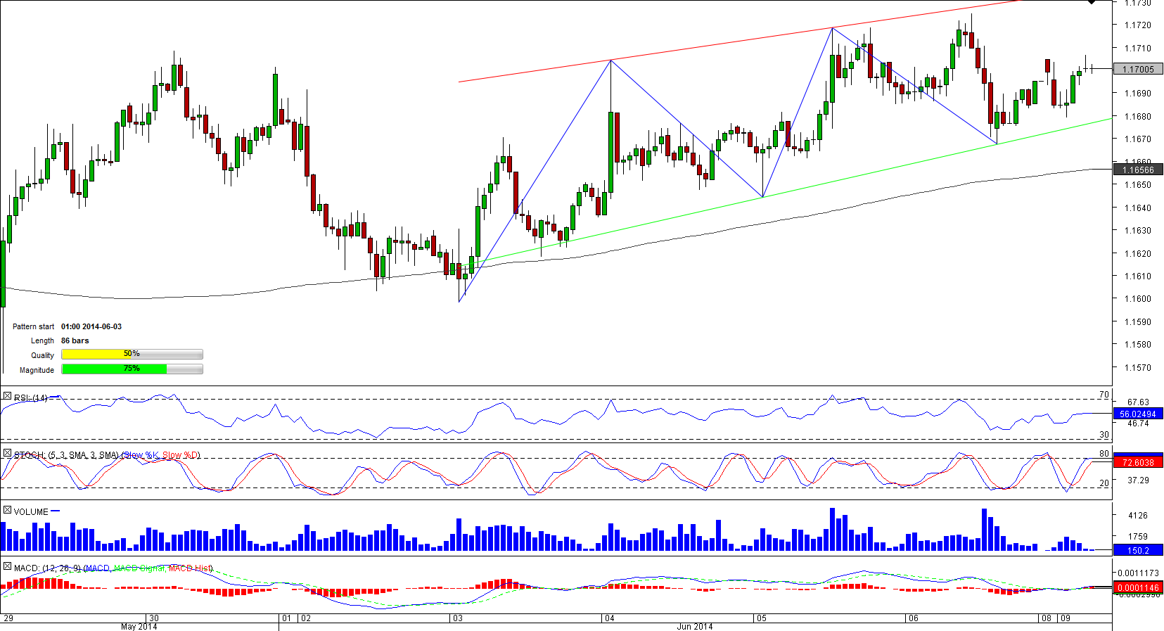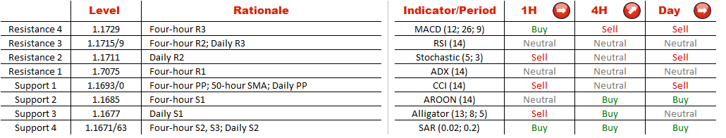 After attaining a one-month high of 1.1724, the pair retreated slightly and now is trading above the 50-hour SMA at 1.1692 that may serve as a prop for a climb. If this comes true, the pair will move to 1.1707/19 (four-hour R1, R2; daily R2, R3), a rise above which may bring the recent high back to the picture.