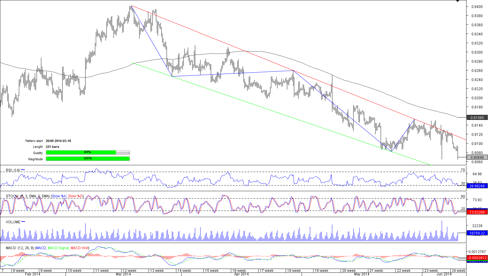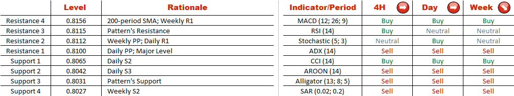 The single currency has been losing ground versus the Sterling since March 18. Last week's ECB's meeting added to pair's volatility and the pair penetrated the upper trend line. However, later, the pair plunged to this year's low at 0.8064. According to aggregate technical indicators, the pair will stabilize around the current level (0.8072) for some time, as indicators on a 4H and daily charts are neutral. However, indicators on a longer weekly chart are suggesting after a pause the will head to the south with a fresh impulse. A move below recent low and daily S2 at 0.8065 will clear the way for daily S3 and then towards pattern's support at 0.8031.