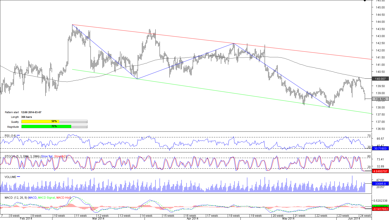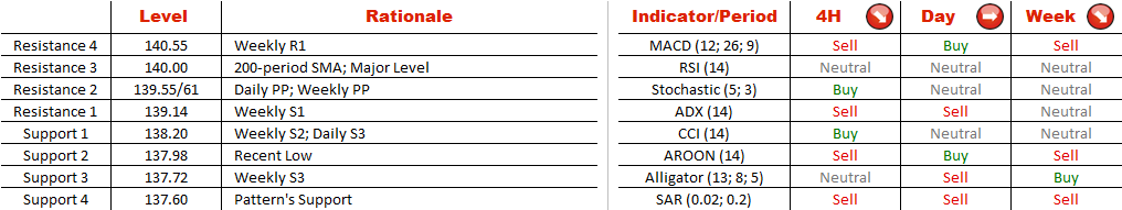 The EUR/JPY pair has been moving sideways since the beginning of this year. Though a formation of the channel down pattern is a clear indication of the downward trend, the decline is not that steep and the pair is approaching a strong support at 137.98. Aggregate technical indicators as well as pending orders in a 100 pips range, are all pointing at pair's further depreciation. Fundamentals are also speaking in favour of Yen's strengthening later this week, hence, the outlook for the pair is bearish. Nonetheless, bears will consider a move below 137.98 only in case of the strongly hawkish comments from the BoJ.