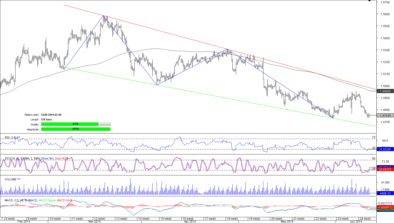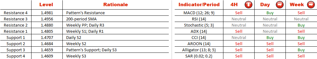 After touching 1.4728 on May 30, the pair moved towards the upper trend line, meaning traders are still ready to continue benefit from pair's fluctuation between two trend lines. Nevertheless, ECB's decision to cut rates provoked a massive sell off of the single currency and the pair was not able to reach the upper trend line. At the moment of writing, the price stood at 1.4748, just slightly below the daily S1. According to aggregate technical indicators, the pair will continue depreciating in the nearest future, thus, a move below 1.4720 can be expected. It is hard to predict whether the price will move significantly lower, as indicators on a daily and weekly chart are neutral.