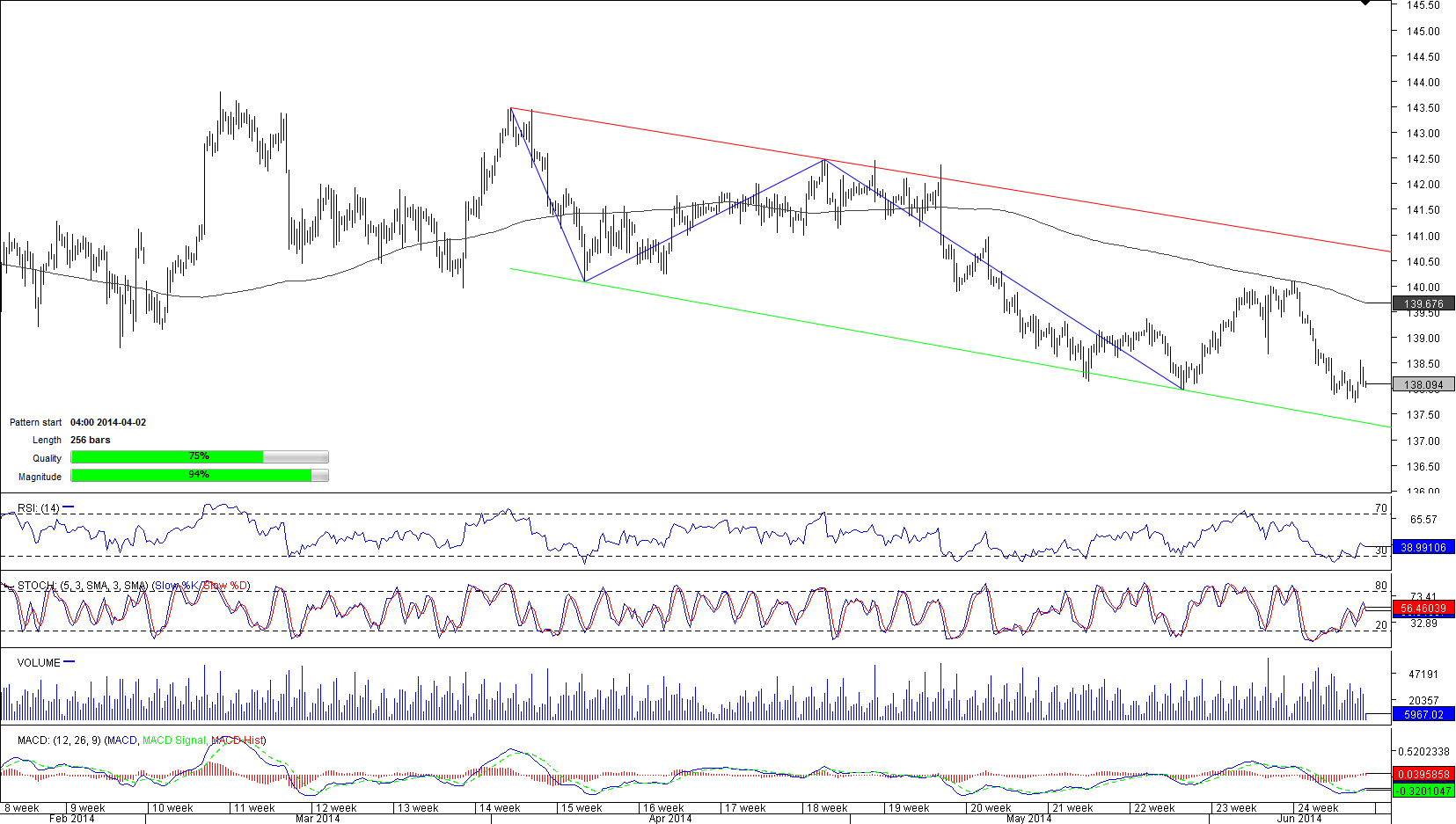 The EUR/JPY pair has been trading in boundaries of the channel down pattern since April 2. The latest bearish impulse was received on June 9, as the pair touched the 200-period SMA and bounced back, trading now between daily R2 and weekly S3 just in a 85-pip range. The key support is located at 137.72, however, according to ‘sell' signals from technical indicators, the pair will head towards this level anytime soon again. Market sentiment is not clearly marked, while pending orders in a 100-pip range are distributed almost evenly. We do not expect any significant movements on Friday, hence the pair will mostly continue fluctuating in the above-mentioned range.