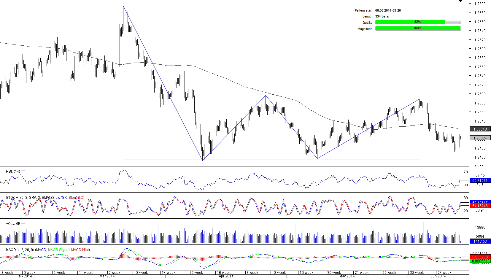 Rectangles are usually formed during a pause in the movement. In this particular case, the USD/SGD refused to move above 1.2793 and plunged to 1.2453. Since early April the pair has been trading in boundaries of the rectangle pattern, moving between two parallel trend lines, located at 1.2592 and 1.2453. This is a 137-pip range, hence, both quality and magnitude are above the average values, meaning even slight movements can lead to substantial profits. The short– and medium–term outlooks are not clear, as technicals are neutral. In a longer term, however, the pair likely to resume falling down, as aggregate technicals on a weekly chart are sending ‘sell' signal.