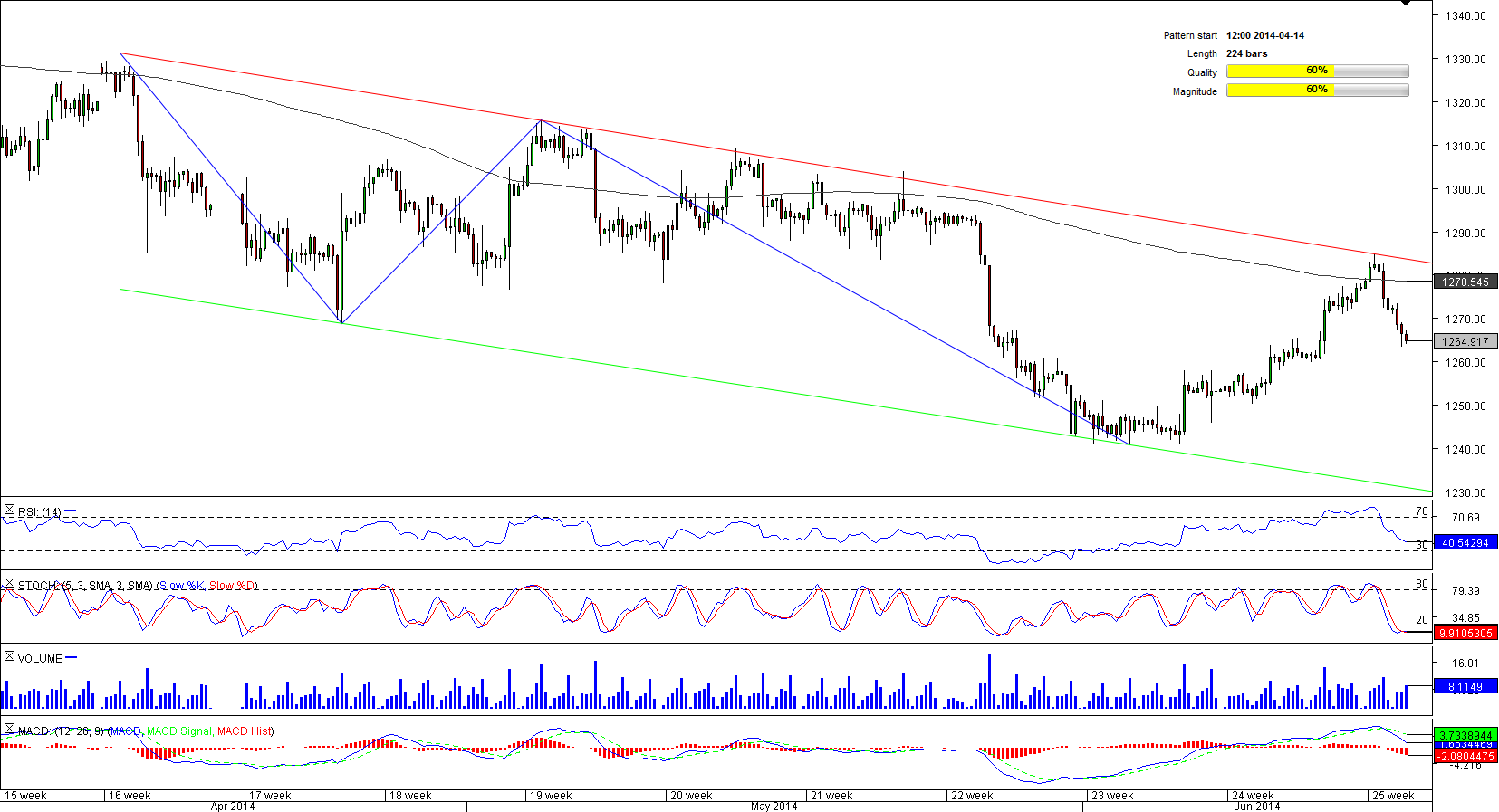 Last time we looked at this bearish channel, the currency pair was undergoing a bullish correction. Since then XAU/USD has respected the upper boundary of the corridor at 1,285 and has come under strong selling pressure that is currently pushing the price towards the lower falling trend-line at 1,231, where we can expect yet another transient rally.