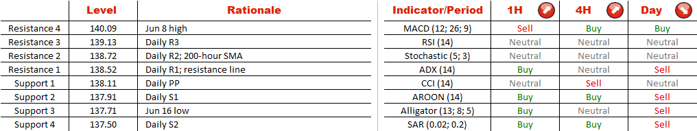 A precipitous decline and subsequent formation of two distinct valleys suggest EUR/JPY has already bottomed out. Still, in order to confirm its bullish intentions the currency pair is required to settle above the neck-line at 138.52, which is reinforced by the daily R1. Then the subsequent objective will be a cluster of resistances at 138.72, where the daily R2 merges with the 200-hour SMA and could potentially prevent further appreciation of the single European currency. And while the near-term technical studies support this view, the daily indicators are mostly giving ‘sell' signals, thereby calling into question EUR/JPY's ability to reach Jun 8 high standing next to 140.
