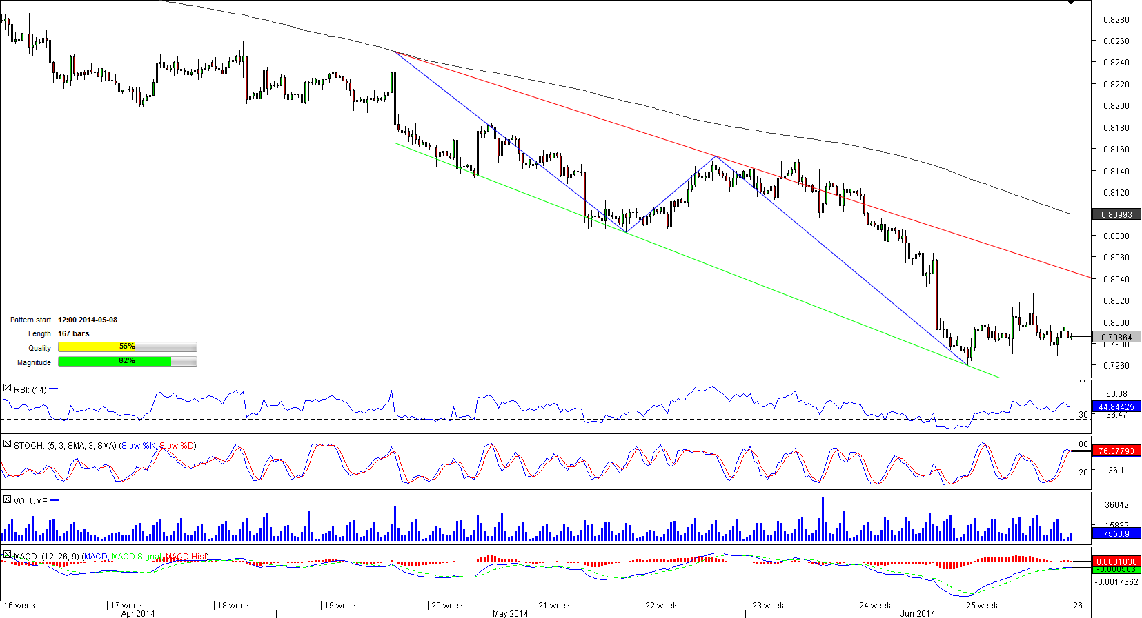 EUR/GBP has been under heavy selling pressure for more than 10 months started in August 2013 when the pair reached a one-year high of 0.8771. In mid-March, the pair's bearish tendency became more distinct thus helping the instrument to shape a 167-bar long downward-sloping tunnel.