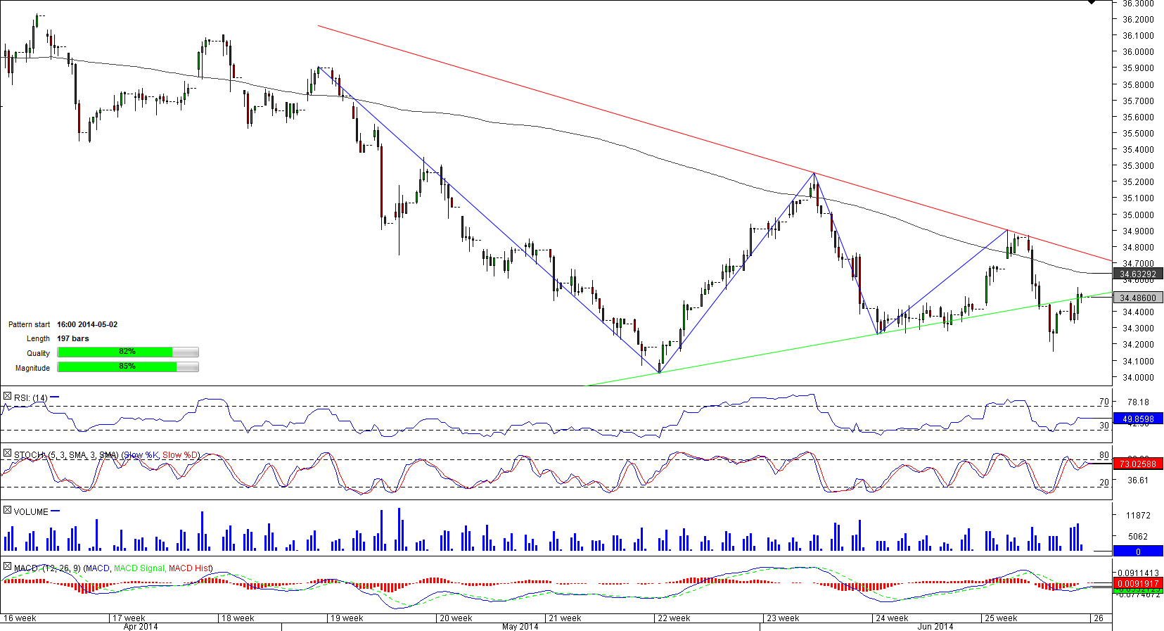 It seems that the recent exit from the 197-bar long triangle pattern was a demonstration of a false breakout as USD/RUB managed to re-approach the pattern's support within one day after the drop occurred. However, this affirmation may appear ill-grounded considering that the pair is still unable to settle above the lower boundary of the formation and that over 72% of market players on the SWFX hold bearish view on the pair. Moreover, USD/RUB is trading not far away from the apex that will be reached in the second part of the week, adding to signs the current weakness may be the beginning of a massive sell-off.