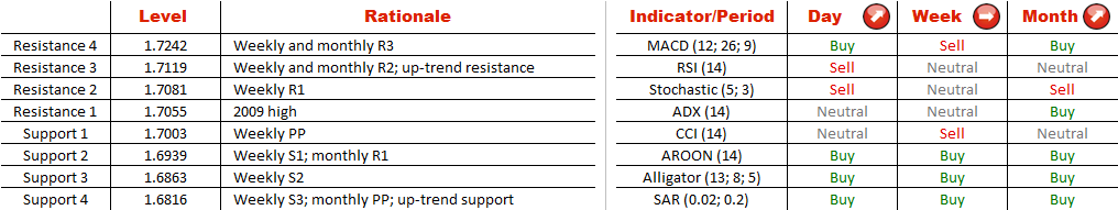 Since last year's July GBP/USD has been in a major up-trend. And even though most of the technical indicators suggest the demand is going to continue pushing the price further north, there are signs that we are on the verge of a major reversal. Firstly, the currency pair is facing an important resistance level, represented by the 2009 high at 1.7050. Secondly, there is a rising wedge pattern emerging, meaning the downside risks are now greatly increased. Accordingly, if the support at 1.68 is breached, it will most likely imply an extension of the sell-off, potentially down to the Feb 5 low at 1.6250. As for the sentiment, it is strongly bearish—74% of open positions are currently short.