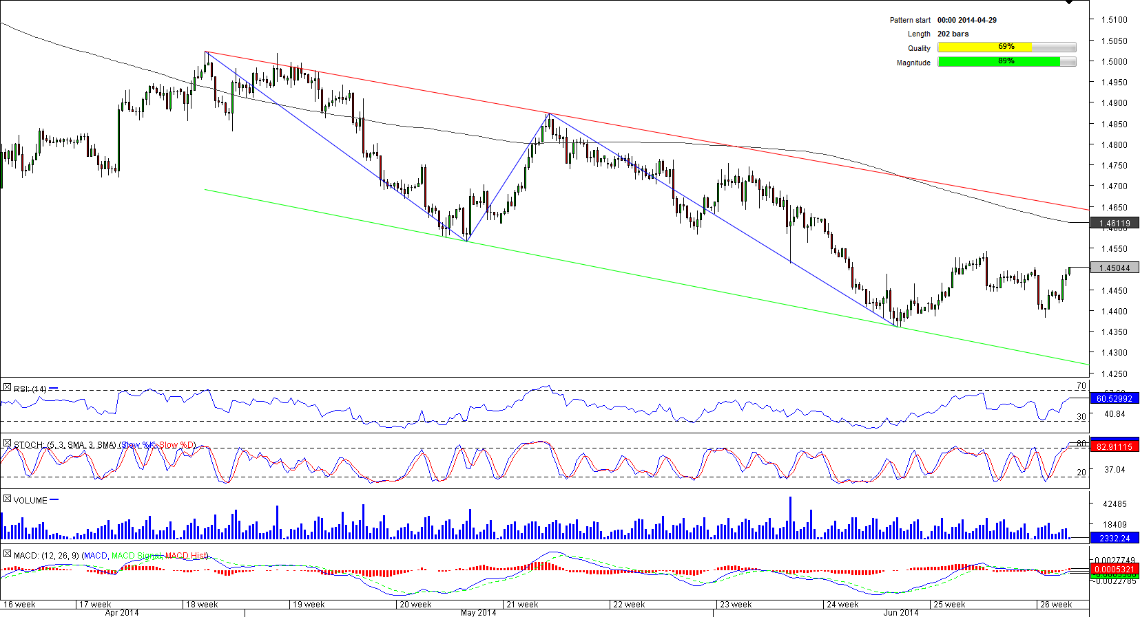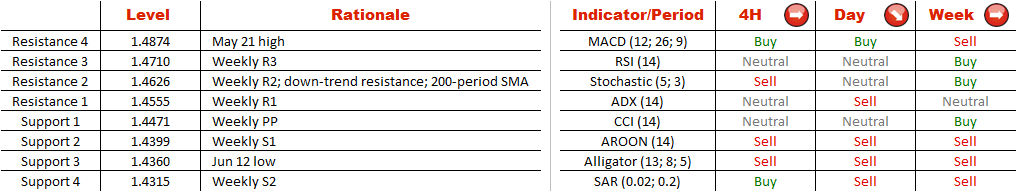 Following a brief upward correction in the overall bearish market EUR/AUD started to trade between two parallel falling trend-lines. Accordingly, a current rally from 1.4360 should soon come to an end near 1.4626, a cluster of resistances created by the weekly R2, 200-period SMA and down-trend line. Then the currency couple will be in a good position for another pronounced leg down. And even though the technical studies are not supportive of a decline by being largely mixed, the distribution between the open positions is notably skewed in favour of the shorts. At the moment the bears constitute 67% of the SWFX market.