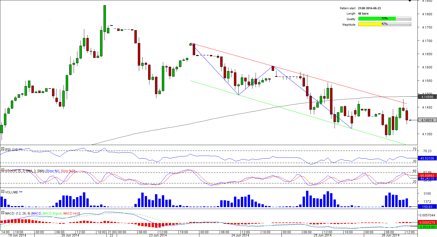 Right now the currency pair is trading just below the upper trend-line, which is reinforced by the daily pivot point and 200-hour SMA. Accordingly, there is a high possibility of a sell-off from the current level down to the lower trend-line at 4.13. And while the hourly and daily technical indicators are largely mixed, on the four-hour time-frame five out of eight studies are pointing downwards, with the remaining being neutral.