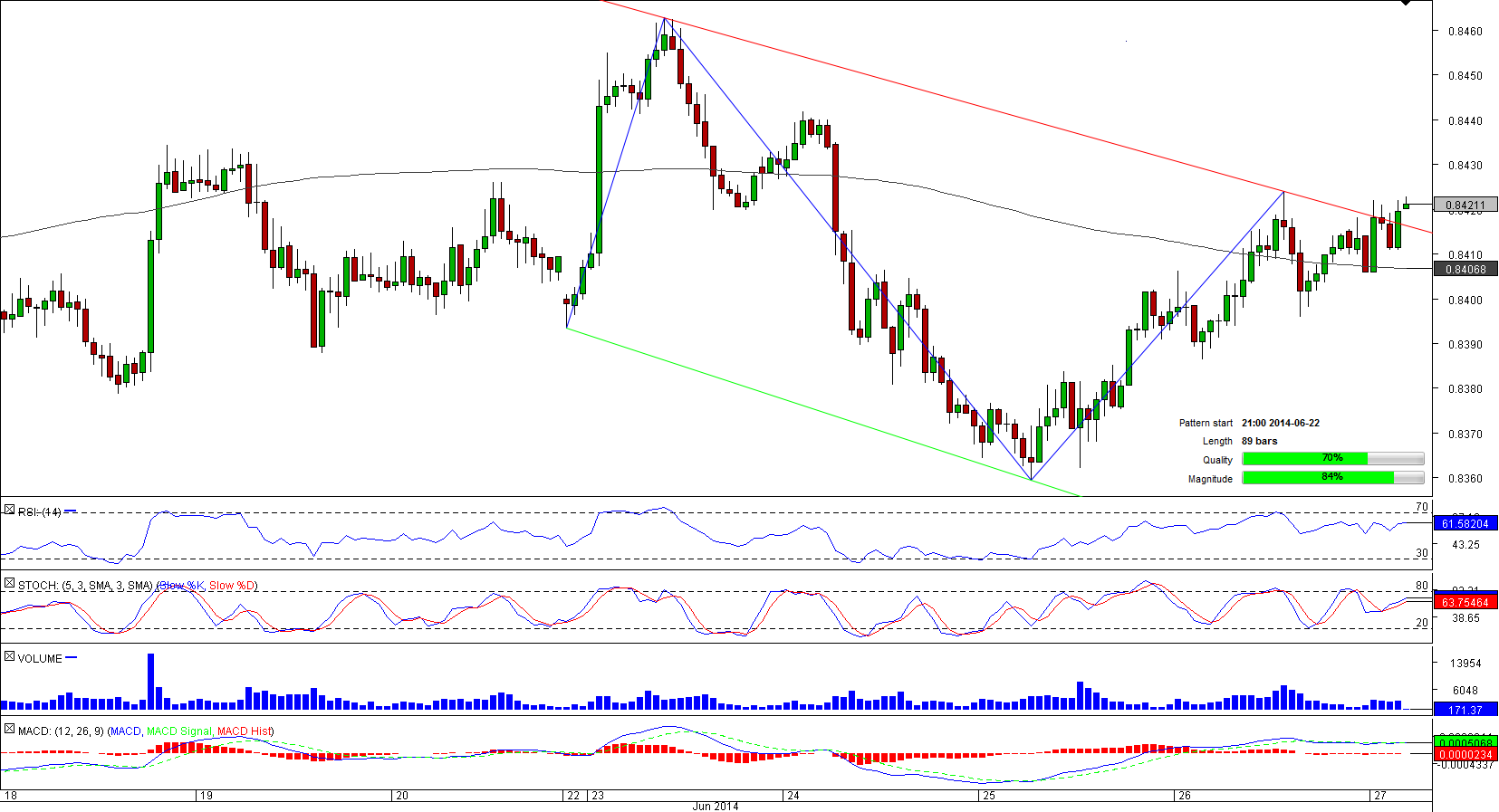 A jump to a one-year high performed by AUD/CHF provoked a rapid decline that took place inside a downward sloping corridor. Last 89 hours allowed the pair to touch the channel's limits several times; however, recently the upper limit of the tunnel has failed to withstand the test since the currency couple managed to surpass the trend-line and now is attempting to settle above this level. Traders believe the endeavour may be successful; in other words, a bullish breakout followed by a rally may happen. According to the SWFX, almost two-thirds of all orders are placed to buy the pair.