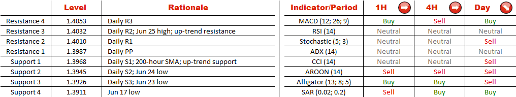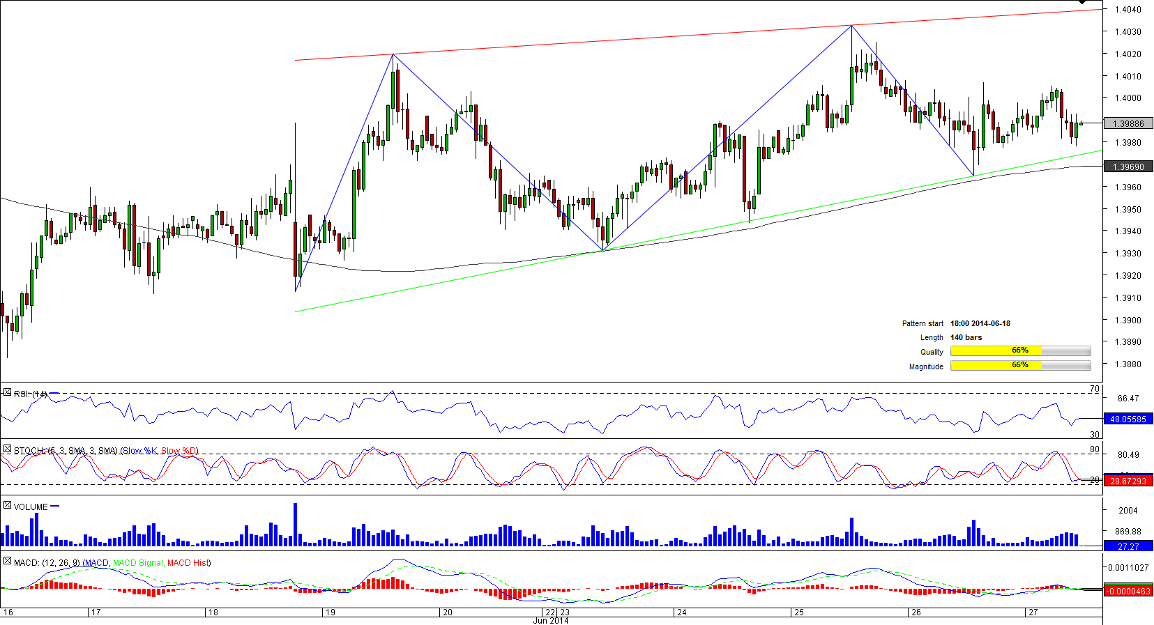 CHF/SGD has been trending upwards since the mid-June, when it bottomed out at 1.3850. However, now there appear signs the current rally may soon come to an end, since the currency pair is forming a rising wedge. But it could be argued that CHF/SGD is forming an ascending triangle instead of a reversal pattern. This will be finally determined where the next bullish wave ends—either before the previous high at 1.4032, which should mean continuation of the bullish momentum, or after the price crosses the Jun 25 high, which will most likely imply a strong sell-off in the nearest future, through the up-trend support line at 1.3968, even though it is reinforced by the 200-hour SMA.