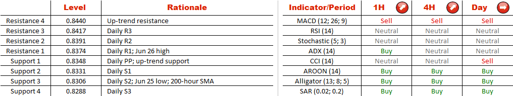 Conversely, if the Canadian Dollar does not manage to preserve the upward momentum as it did during the past 180 hours, the support area at 0.8306, created by the daily S2, Jun 25 low and 200-hour SMA, will try to prevent further extension of a decline.