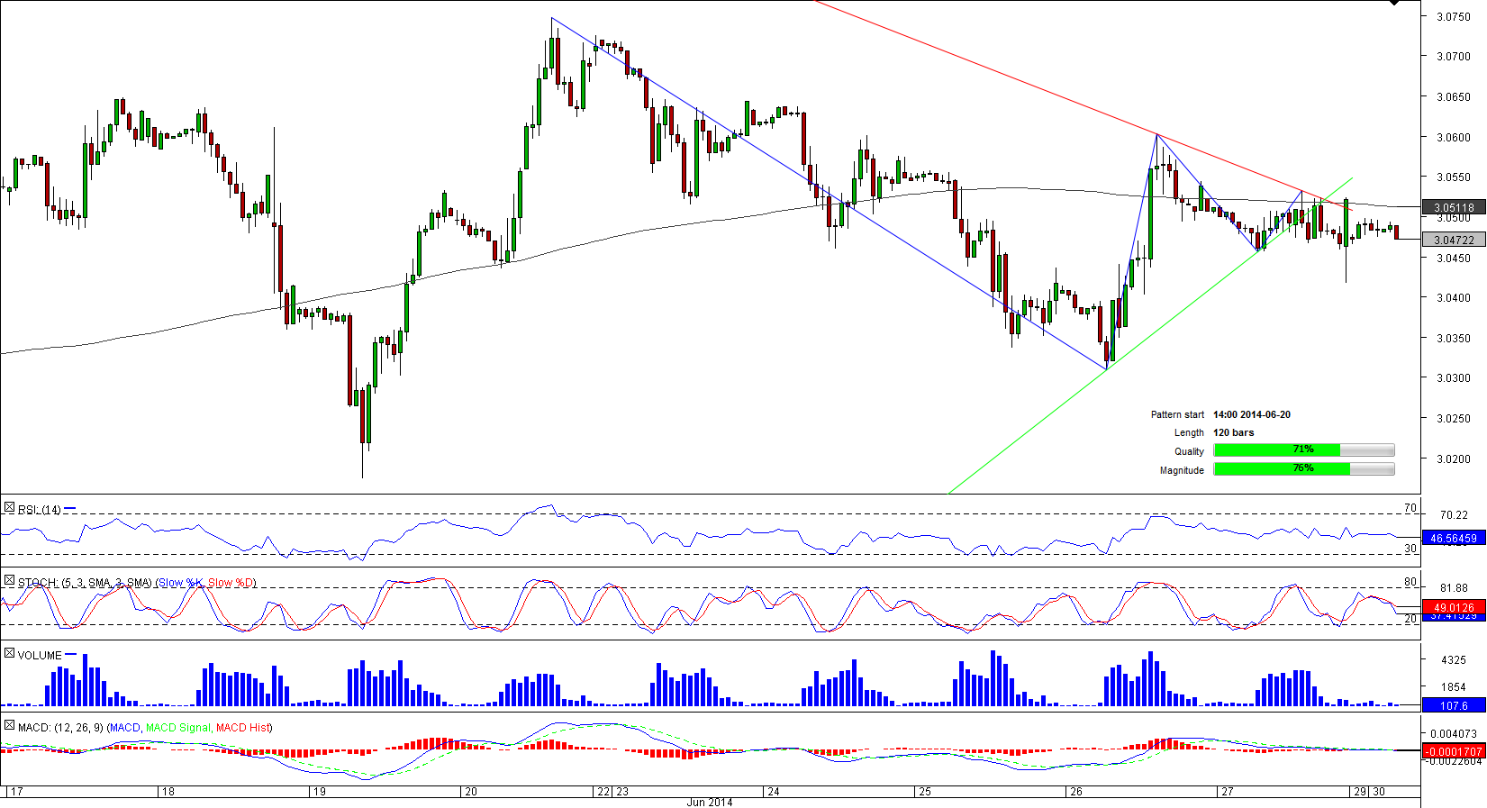 Although USD/PLN broke out of the 120-bar long triangle around 15 hours ago, we have not seen any considerable changes in the pair's tendency yet. It seems the pair remained locked in a 110-pips wide corridor formed by its short-and long-term SMAs; the currency couple was trapped by this channel after a notable drop performed on Jun 20.