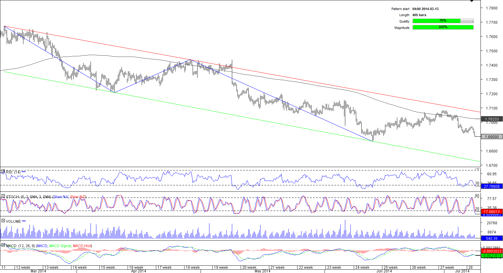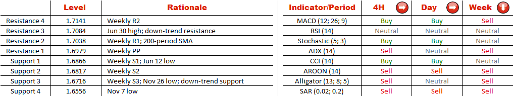Since March the bears have been largely in control of the market, leading to an eight-figure decline and appearance of the downward-sloping channel, meaning the long-term outlook is negative. In the short run the Euro is also considered to be bearish, since the currency has recently bounced off the upper down-trend line. At the moment EUR/SGD is facing the support at 1.6866—Jun 12 low reinforced by the weekly S1 level, but the sell-off is likely to carry on until the price hits a potentially tough demand area around 1.6716, consisting of the lower down-trend line, Nov 7 low and weekly S3. Moreover, a majority of the weekly indicators are giving ‘sell' signals.
