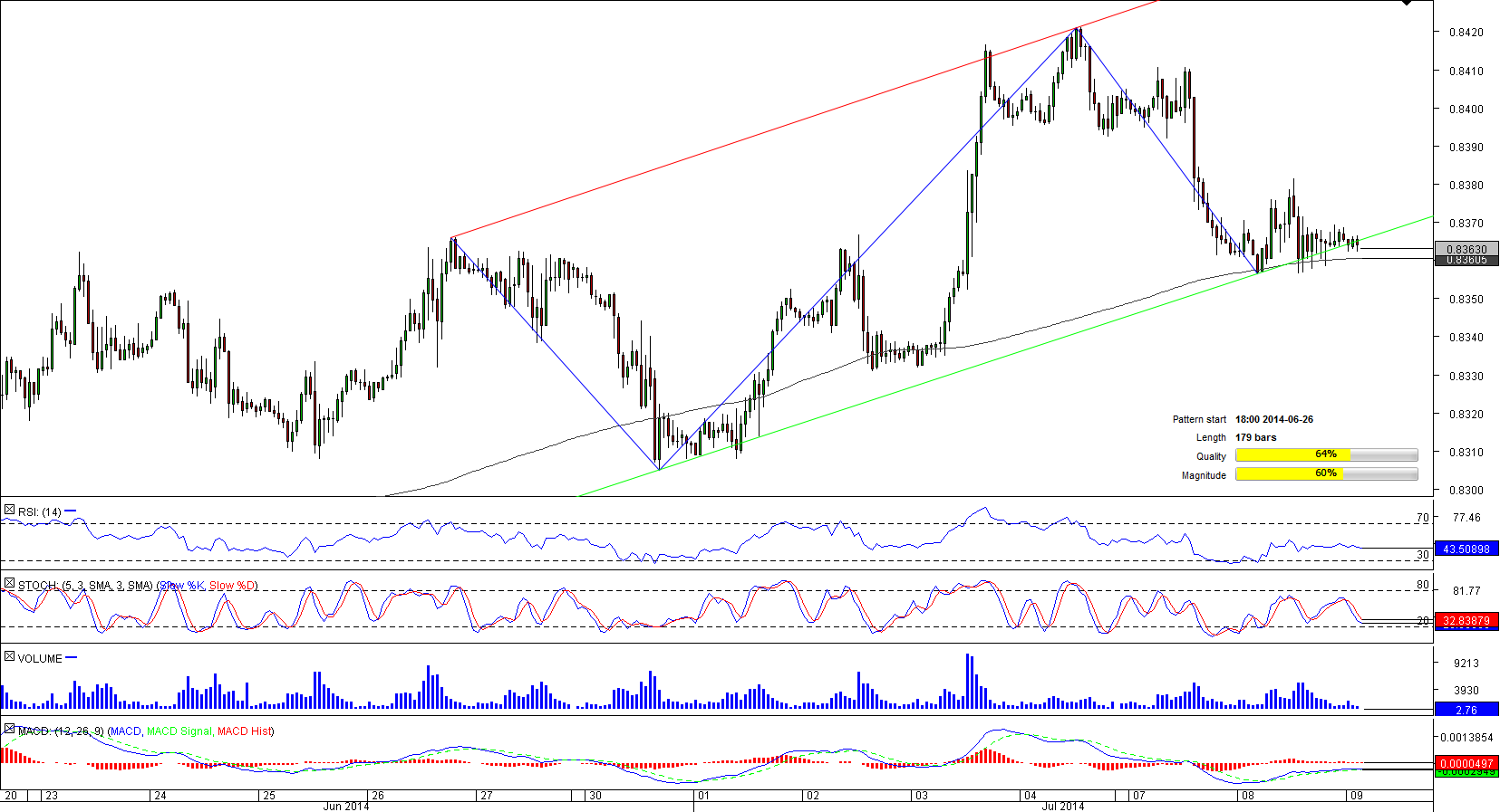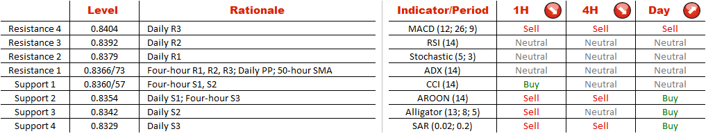 However, the bullish trend might have come to an end since the currency couple plunged below the lower limit of the 179-bar long channel up pattern. Now the instrument is sitting at the 200-hour SMA at 0.8360, a strong support zone reinforced by the four-hour S1. If this mark is broken, the currency couple is likely to move down to 0.8357/4 (four-hour S2, S3; daily S1), below which only 0.8342 (daily s2) and 0.8329 (daily S3) are capable of preventing a massive sell-off.