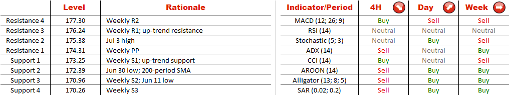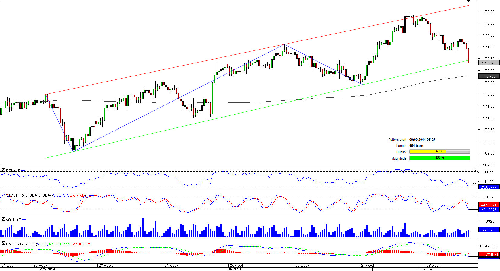 Because of the support at 169.56 the currency pair was able to prevent Jan-May consolidation turning into a sell-off. Instead the Sterling's bullish momentum seems to be gaining traction at the moment, as evidenced by GBP/JPY forming an upward-sloping channel.