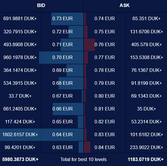 If one looks at the market depth statistics published at dukascoin.com, it can be seen that the DUK+/EUR rate now has additional resistance and support levels to take into account.