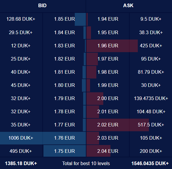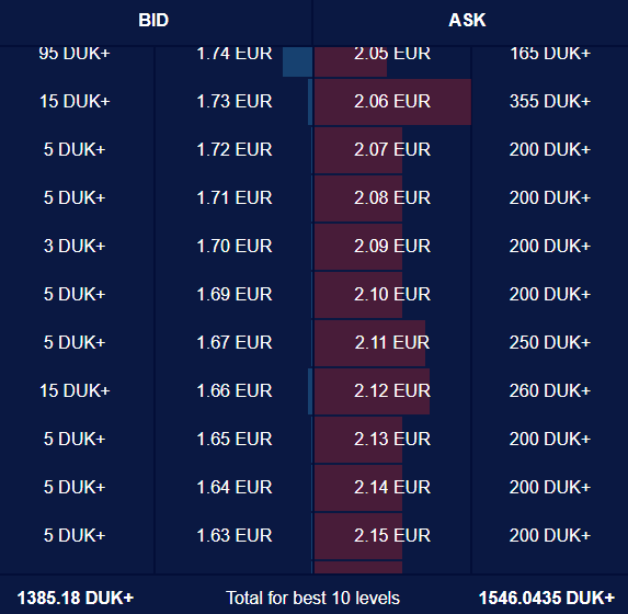 Meanwhile, sell orders are more dispersed and far more numerous. Sell orders start at 1.9600 where 425.00 DUK+ could be sold. Next notable sell order cluster is at 2.0200 with 517.50 DUK+ to be sold.