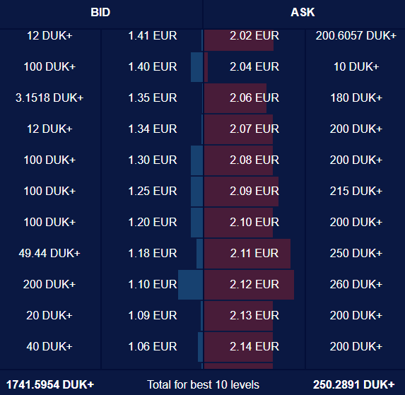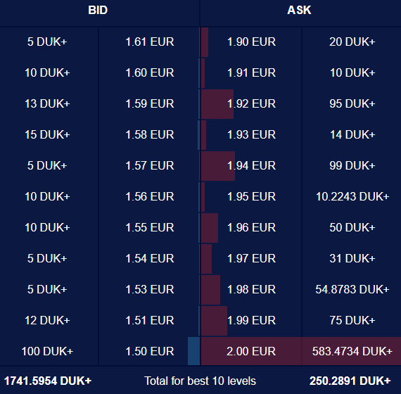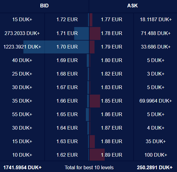 In the meantime, at the 1.7000 there is a major cluster of buy orders, as 1223.39 DUK+ would be bought up, if the price for the coin would reach this level.