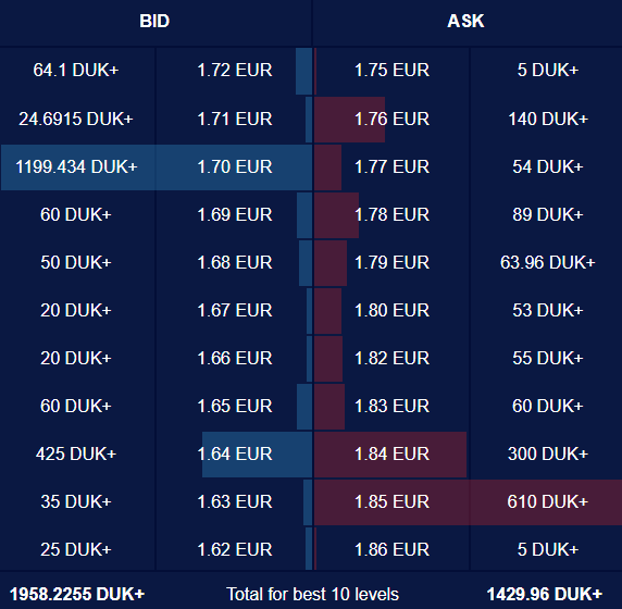 In the meantime, there is only one price level, where buy orders are located at in large numbers. At the 1.7000 level, there are orders to buy almost 1,200 Dukascoins.