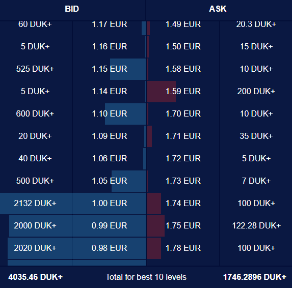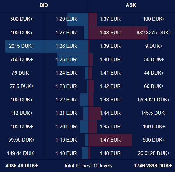 In the meantime, there were orders to buy 2775 Dukascoin near the 1.2600 mark. Meanwhile, there were orders to buy at least 500 coins at 1.1500, 1.1000 and 1.0500.