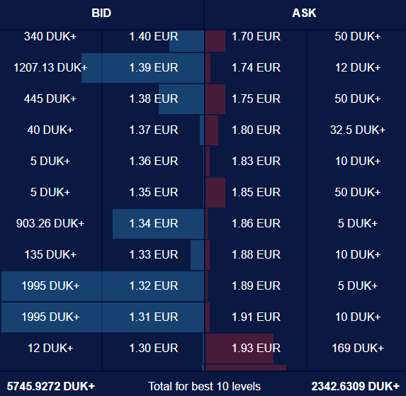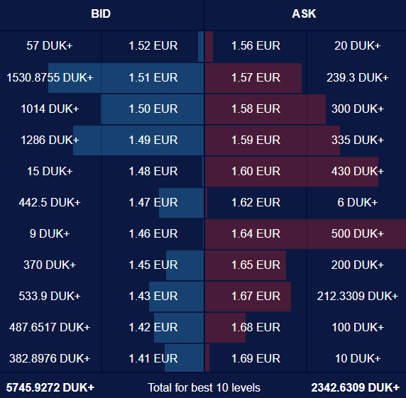 In the meantime, a large cluster of buy orders was located from 1.5100 to 1.4900. In this range, there were orders to buy almost 3,000 DUK+.