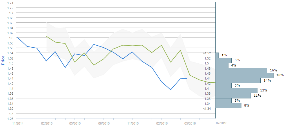 The majority of traders (56%) believe the British currency is to cost 1.44 or less dollars after a three-month period. The most popular price interval was selected by 18% of the voters, namely the 1.44-1.46 one, while the second most popular choice implies that the Sterling is to cost between 1.46 and 1.48 dollars in three months, chosen by 16% of the surveyed. At the same time, the mean forecast for July 20 is 1.4221.