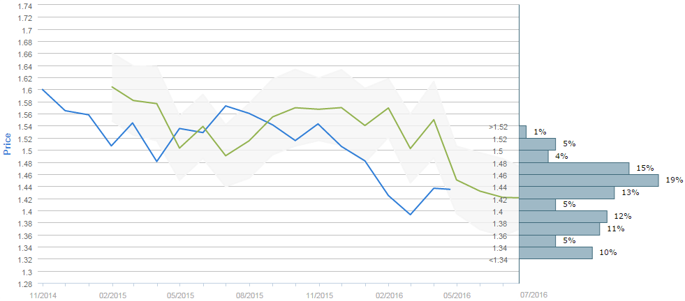 The majority of traders (56%) believe the British currency is to cost 1.44 or less dollars after a three-month period. The most popular price interval was selected by 19% of the voters, namely the 1.44-1.46 one, while the second most popular choice implies that the Sterling is to cost between 1.46 and 1.48 dollars in three months, chosen by 15% of the surveyed. At the same time, the mean forecast for July 21 is 1.4208.