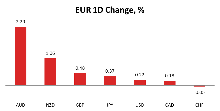 Wednesday was fully packed with different fundamental data releases and statistical development around the globe helped the Euro to become one of the best-performing currencies across the board. EUR/AUD was the daily leader with a surge of 2.29%, which followed very discouraging inflation figures from Australia. In fact, quarter-on-quarter consumer prices in this South Pacific country dropped for the first time since 2009, missing expectations for an increase. Alongside, Q1 annual inflation weakened to 1.3% from 1.7% in the previous three-month period, thereby adding to speculation the Reserve Bank of Australia will be forced to act at one of upcoming monetary policy meetings and cut the key interest rate. The New Zealand Dollar slipped by 1.06% against the Euro, owing to warnings of the Reserve Bank of New Zealand on the issue of future interest rate cuts. It held steady at 2.25% yesterday, but indicated that easing might be necessary in order to decrease bullish pressure on NZD. Other currency pairs were bid as well, with EUR/GBP adding 0.48% and EUR/USD gaining 22 bps. The Sterling failed to appreciate after data revealed the UK economy slowed down in Q1, but annual growth still surprised to the upside. As for the US, the Federal Reserve kept the interest rate target unchanged, but it dropped earlier concerns about global economy. However, it has not directly pointed to the June interest rate hike.