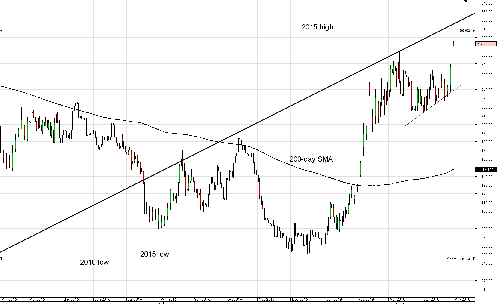 Gold traded near a 15-month high on Monday as a decline in the US Dollar and weakness sin global equities sent the precious metal to near $1,300 an ounce. Last week the greenback experienced its biggest weekly percentage drop versus the Japanese Yen since the 2008 financial crisis following the Bank of Japan's decision not to ease policy further. Bullion was also supported by weak US fundamentals that supported the Fed's cautious approach to higher interest rates.