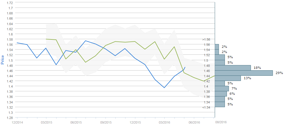 The majority of traders (61%) believe the British currency is to cost 1.44 or more dollars after a three-month period. The most popular price interval was selected by slightly more than a quarter (29%) of the voters, namely the 1.44-1.46 one, while the second most popular choice implies that the Sterling is to cost between 1.46 and 1.48 dollars in three months, chosen by 18% of the surveyed. At the same time, the mean forecast for May 03 is 1.4383.