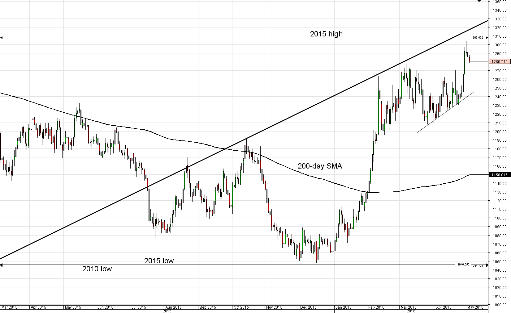 The bullion failed to set another 15-month record yesterday, after American session was largely marked by the Greenback's rebound. Gold futures closed the trading around 1,286.50, but weakness is at risk of prolonging through the next 24 hours of market activity. The key support is placed at 1,272.92, namely the weekly pivot point, followed by the second demand precisely $20 below it (monthly PP). Dips lower are unlikely, also given that the mentioned monthly pivot is additionally backed by the April 29 low.Daily chart