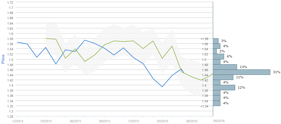 Dukascopy Community members, however, have mostly bearish perspective while the consensus forecast stands for 1.44-mark, still above last week's average price of 1.42. Furthermore, equal number of respondents are having bullish and bearish views on the pair.