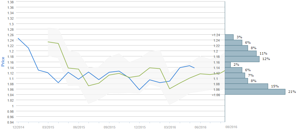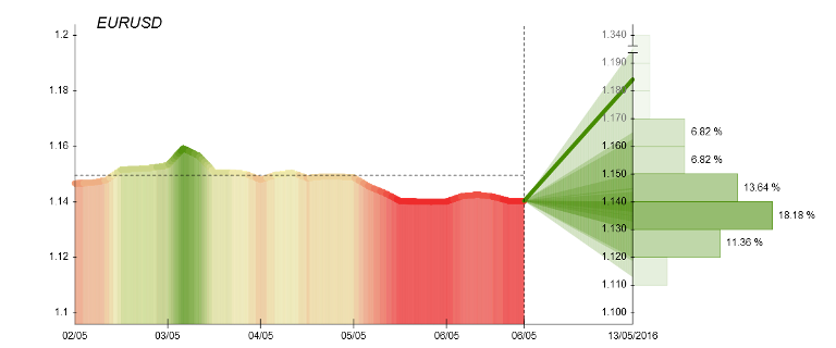 Almost eight out of ten Dukascopy traders are suggesting the common European currency will diminish against the US Dollar this week, as they have provided a forecast to sell this currency pair. The vast part of price expectations is placed in the range between 1.12 and 1.15; however, some extremely positive estimates from some Community members naturally pushed the average projection for May 13 as high as 1.18.