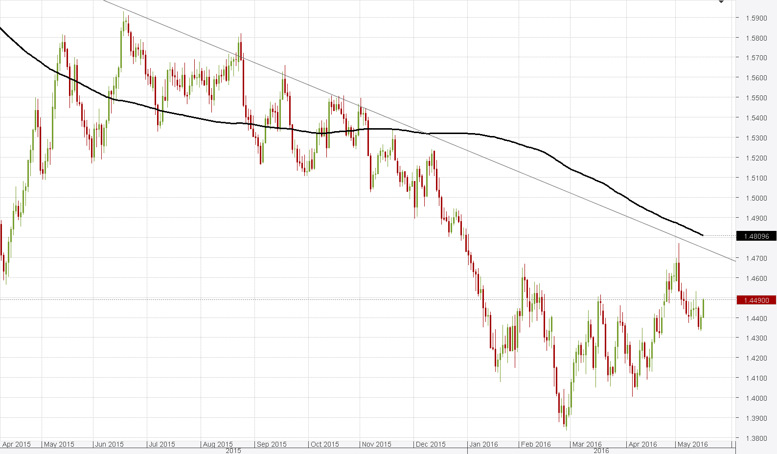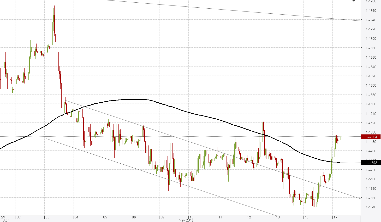 - Support is around 1.4340, represented by the 55 and the 100-day SMAs