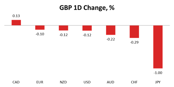 The British Pound began the week with rather poor performance, as it sustained losses against most major peers on Monday. Risk aversion kept strengthening the Japanese Yen, causing the GBP/JPY pair to edge 1.00% lower. Other somewhat notable losses of 0.29% and 0.22% were registered against the Swiss Franc and the Aussie, respectively, whereas the Sterling also dropped 0.12% lower versus both the Kiwi and the Greenback. The British currency suffered the least against the Euro, having edged only 0.10% lower, but the only currency it was able to outperform was the Loonie, adding 0.13% against it.