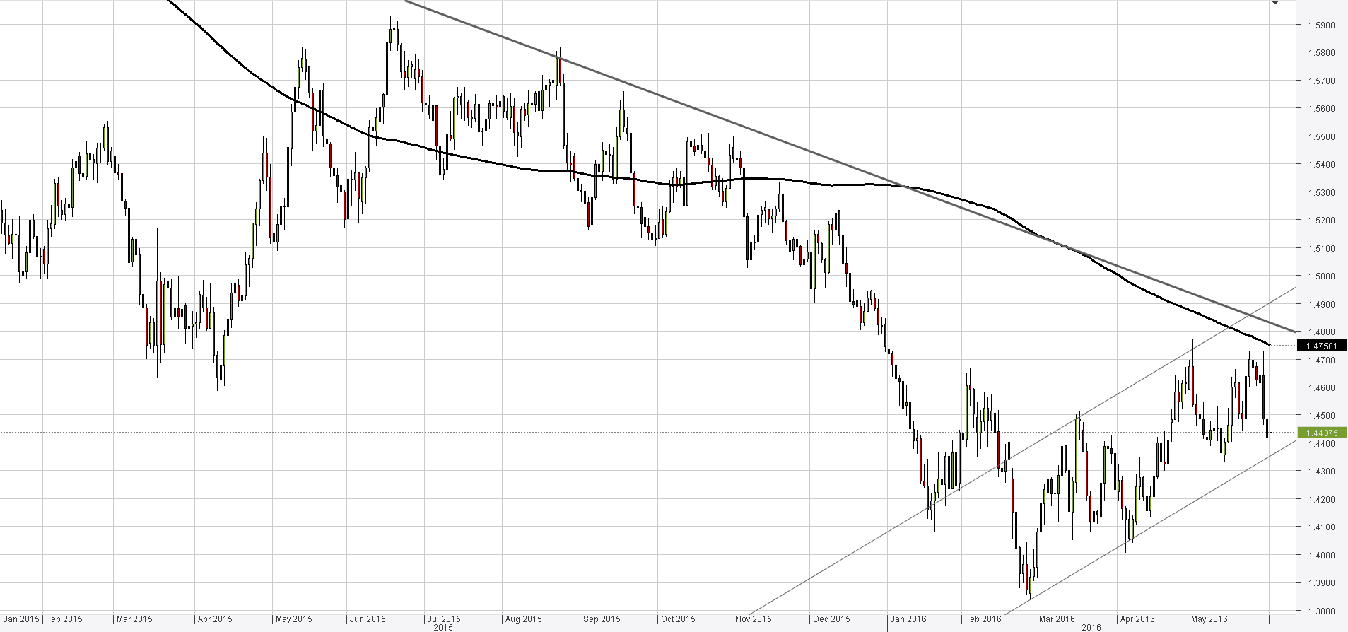 GBP/USD moved even closer towards 1.4340/1.4290 yesterday, and a test of this demand area, created by the 100-day SMA, up-trend and monthly S1, will be a strong bullish sign for June. Meanwhile, the immediate support is at 1.44, implied by the 55-day SMA, and it is seen as able to push the price back towards the weekly S1. As for the longer-term perspective, also considering the monthly technical indicators, the Cable should bounce off of 1.48 and thus resume its descent from 1.72 dollars started back in the third quarter of 2014.