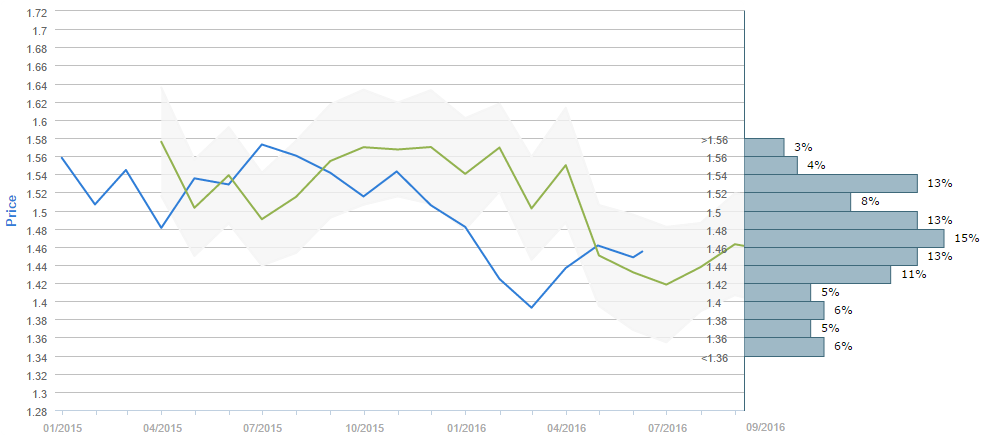 The majority of traders (56%) believe the British currency is to cost 1.46 or more dollars after a three-month period. The most popular price interval was selected by slightly less than a fifth (15%) of the voters, namely the 1.46-1.48 one, while the second most popular choice implies that the Sterling is to cost either between 1.44 and 1.46, or between 1.48 and 1.50 or even between 1.52 and 1.54 dollars in three months, all three chosen by 13% of the surveyed. At the same time, the mean forecast for Sep 08 is 1.461.