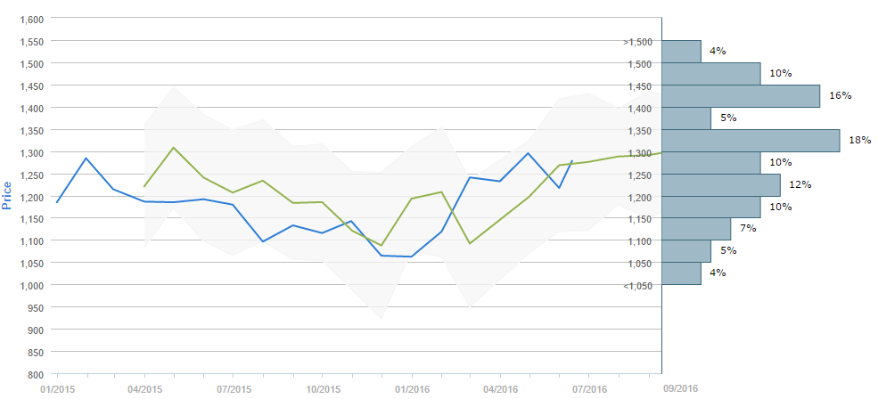 Traders who were asked regarding their longer-term views on gold between May 13 and June 13 expect, on average, to see the metal around 1,275 by the end of August. Generally, 58% (-1%) of participants believe the price will be generally above 1,250 in ninety days. Alongside, 29% (-2%) of those surveyed reckon the price will trade in the range between 1,100 and 1,250 over the next three months